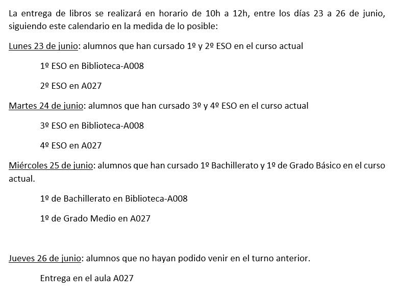 Esas son las fechas para los alumnos que tengan libros prestados en este curso 2024/25, tanto de ayuda como de banco de libros.